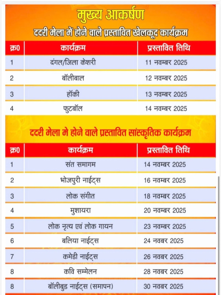 जिलाधिकारी की अनुमति के बाद मुख्य विकास अधिकारी ओजस्वी राज ने ददरी मेला कार्यक्रम जारी किए। जारी कार्यक्रम सूची के मुताबिक 11 से 14 नवंबर तक खेल प्रतियोगिता आयोजित होगी। 14 नवंबर से भारतेन्दु कला मंच पर कार्यक्रम होंगे जो 30 नवंबर को समाप्त होंगे। संत समागम 14 नवंबर को, भोजपुरी नाइट्स 16 नवंबर को, लोक संगीत 18 नवंबर को, मुशायरा 20 नवंबर को, लोकनृत्य एवं लोकगायक 23 नवंबर को, बलिया नाइट्स 24 नवंबर को, कामेडी नाइट्स 26 नवंबर को तो अखिल भारतीय कवि सम्मेलन 28 नवंबर को होगा। बालीवुड नाइट्स के साथ समापन 30 नवंबर को होगा।