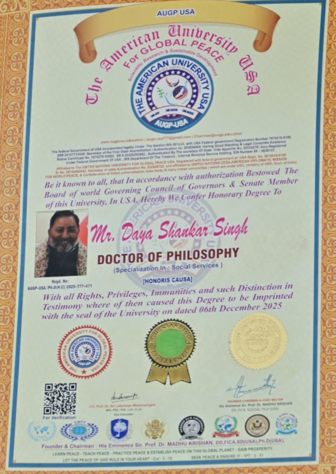 यह आमतौर पर डॉक्टरेट या मास्टर डिग्री होती है और व्यक्ति के असाधारण कार्यों और प्रतिष्ठा को सम्मानित करती है। कहा कि परिवहन मंत्री दयाशंकर सिंह भी राजनीति से लेकर संगठन तक के कार्यों में अतुलनीय योगदान दिया है।
