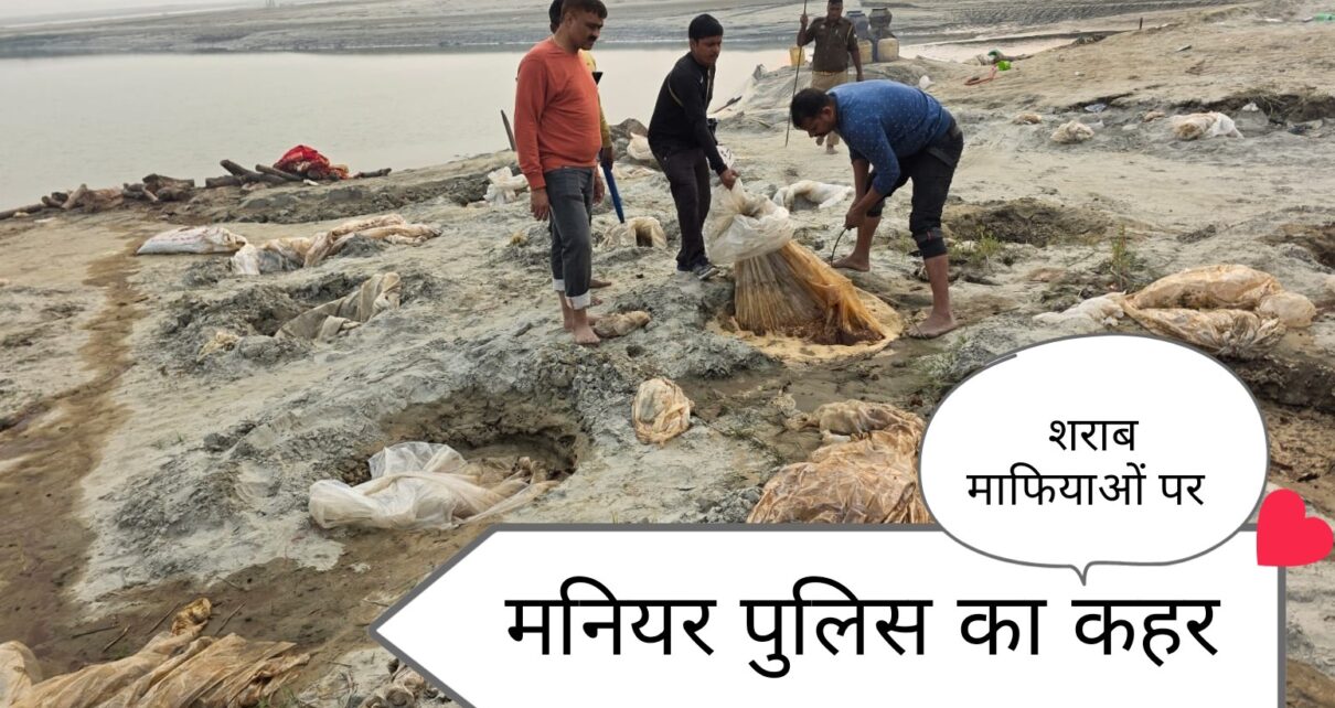 पुलिस अधीक्षक ओमवीर सिंह के निर्देशन मे अवैध शराब की बिक्री निष्कर्षण व अन्य मादक पदार्थो के विरुद्ध चलाये जा रहे सघन अभियान के क्रम में मनियर पुलिस ने को एक बड़ी सफलता मंगलवार को भी प्राप्त हुई। पुलिस ने शराब माफियाओं की कमर तोड़ते हुए अवैध कच्ची शराब बनाने के एक बड़े कारखाने को नष्ट करते हुए 80 हजार लीटर अवैध कच्ची शराब और लहन नष्ट किया। थानाध्यक्ष मनियर कौशल कुमार पाठक ने अपनी टीम संग घाघरा नदी के उस पार बिहार बार्डर पर छापा मार अवैध कच्ची देशी शराब बनाने के उपकरण लहन, नौसादर, फिटकिरी आदि सामाग्री नष्ट किया। लगभग 80 हजार लीटर लहन तथा 8 अवैध भट्टी नष्ट किया। मौके पर कोई भी शराब बनाने वाला व्यक्ति मौजूद तो नहीं मिला पर क्षेत्र के शराब माफियाओं में बड़ा खौफ है।
