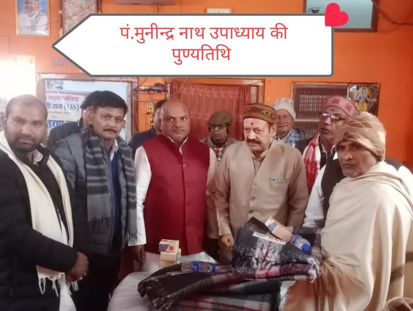 पं. मुनीन्द्र नाथ उपाध्याय की पुण्यतिथि पर उनके पुत्र वरिष्ठ भाजपा नेता पं राजीव उपाध्याय ने वृद्धाश्रम के सभी सवासियों को कंबल वितरित किया गया। पं. राजीव उपाध्याय ने एक एक कर सभी वृद्ध जनों को कंबल वितरित किया। वृद्ध जनों ने पं. राजीव उपाध्याय को अपना आशीर्वाद दिया। वरिष्ठ भाजपा नेता सियाराम यादव, वरिष्ठ कांग्रेस नेता सचिदानंद तिवारी, भाजपा नेत्री स्मृति सिंह और अजय उपाध्याय बबुआ जी ने पं. मुनीन्द्र नाथ उपाध्याय को श्रद्धांजलि अर्पित किया। पं. मुनीन्द्र नाथ उपाध्याय के चित्र पर सभी जनों ने पुष्पांजलि अर्पित की। इस दौरान सच्चिदानंद तिवारी, सियाराम यादव, अजय उपाध्याय “बबुआ”, पूर्व प्रधान स्मृति सिंह, शंकर यादव आदि मौजूद थे। कंबल वितरण कार्यक्रम का संचालन भाजपा नेता जितेन्द्र राय ने किया। वृद्धाश्रम के प्रबंधक अजीत कुमार ने सबके प्रति आभार जताया।