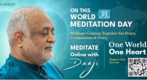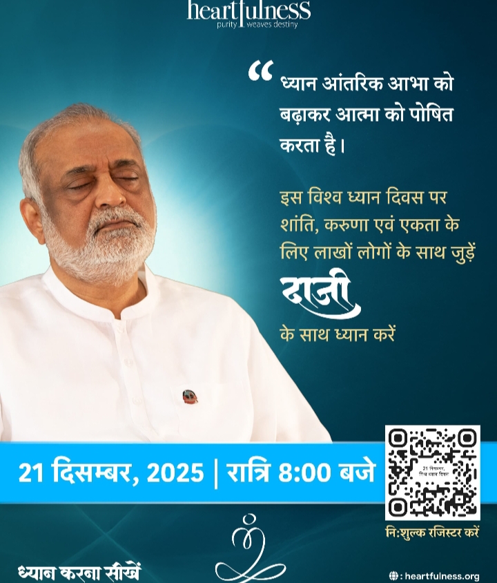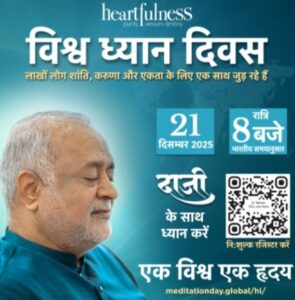 हार्टफुलनेश संस्थान के सान्निध्य में 21 दिसंबर 2025 को विश्व ध्यान दिवस का आयोजन किया जा रहा है। इस अवसर पर रात्रि 08:00 बजे, विश्व भर से 10 लाख से अधिक साधक एक साथ जुड़कर, घर बैठे मात्र 20 मिनट का ध्यान कर विश्व शांति, सौहार्द और सकारात्मकता के वातावरण के निर्माण में अपना योगदान देंगे। यह सामूहिक ध्यान कार्यक्रम न केवल आंतरिक शांति की अनुभूति कराएगा, बल्कि प्रकृति और मानवता के प्रति एकात्म भाव को भी सुदृढ़ करेगा। हार्टफुलनेस ध्यान पद्धति के माध्यम से प्रत्येक व्यक्ति अपने हृदय में संतुलन और शांति का अनुभव कर सकता है। पूरा विश्व इस दिव्य एवं वैश्विक पहल का हिस्सा बनेगा। वैश्विक मार्गदर्शक हार्टफुलनेश संस्थान के कमलेश डी पटेल (दाजी) भी इसमें जुड़ेंगे।
